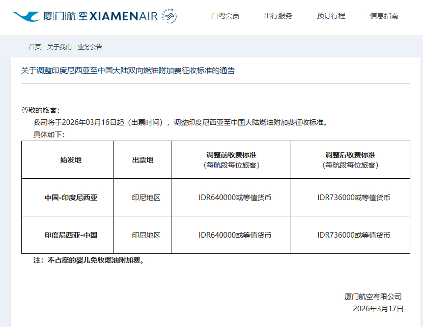 此外,厦门航空3月17日宣布,于2026年03月16日起(出票时间),印度尼西亚至中国大陆燃油附加费征收标准由640000印尼盾(约合人民币259元)调整为736000印尼盾(约合人民币298元),调整幅度为15%。